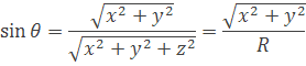 Uhly θ a φ su zakreslené na obrázku. Budem sa zaoberať iba uhlom θ pretože na ďalšie odvodenie rovníc to stačí. sinθ počítame podľa obrázku môžeme odvodiť ako pomer priesečníka súradníc x y polomerom R podľa vzorca