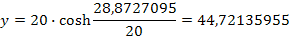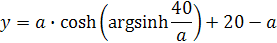 Ten výpočet je taký ako keby sme poznali dĺžku oblúka na kružnici, jeho výšku od osi x a mali vypočítať uhol aj polomer. My poznáme dĺžku hyperboly resp. reťazovky a to je komplikovanejší prípad ako kružnica. Zadané hodnoty sú a=20m, s=40m a y=50m. Z týchto hodnôt si môžeme urobiť skúšku správnosti. vložíme hodnoty do vzorca pre výpočet veľkosti stĺpca kde poznáme polovicu dĺžky lana. y nám musí vychádzať 50m Vo vzorci ale výsledok je iný preto potrebujeme iný vzorec.