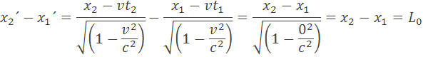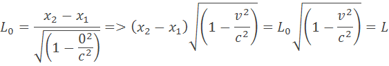 Predstavme si vagón ktorý má dĺžku L0 =t0c a pohybuje sa relativistickou rýchlosťou v. Z prednej steny vystrelí fotón oproti smeru jazdy. Na zadnú stranu dopadne skôr, pretože zadná stena sa posunie o dĺžku t0v. Keby sme sa pozerali na letiaci predmet pri relativistickej rýchlosti videli by sme ho kratší. Rozdiel vzdialenosti môžeme určiť z dvoch sústav. Na sústave S ktorá sa nepohybuje je vzdialenosť na začiatku predmetu x2 a na konci predmetu je vzdialenosť x1. Predmet sa pohybuje v sústave S´. V sústave S´ na začiatku predmetu je vzdialenosť x2´ a nakonci je vzdialenosť x1´. Pri rýchlosti 0 sa musia rovnať rozdiely (x2´ –x1´)=(x2 –x1) pretože teleso stojí a jeho dĺžka je L0. Môžeme to odvodiť zo vzorca