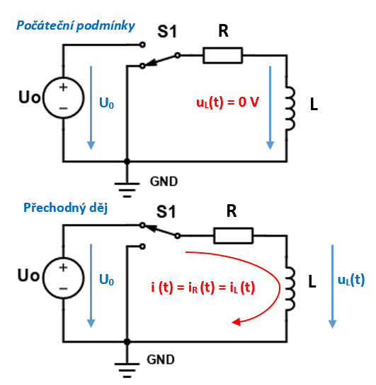 V obvode kde je indukčnosť L zapojená do série s odporom R vzniká prechodový jav pri zapnutí obvodu aj pri skratovani obvodu. Je to spôsobené tým že zmenou prúdu sa zmení magnetický tok. Zmena magnetického toku vytvorí indukované napätie ui na indukčnosti. Indukované napätie pôsobí proti napájaciemu napätiu, znamená to že pri zapnutí sa prúd ustáli až po určitom čase.